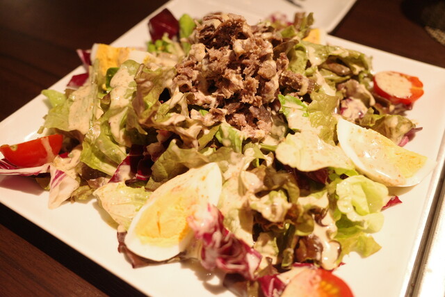 小形牧場のコーンビーフがたっぷり乗った贅沢なサラダです。