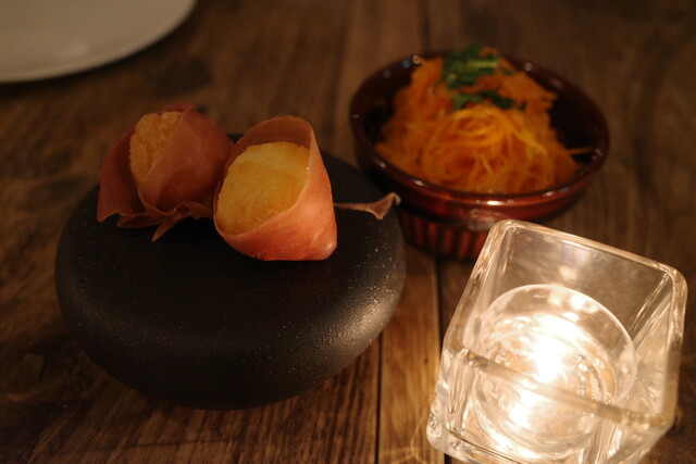 お通しは、ポンデケージョを生ハムで巻いた一品。これがめちゃ美味しかった。
