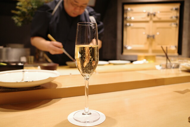 コースはおまかせのみ。まずはシャンパンで乾杯です。