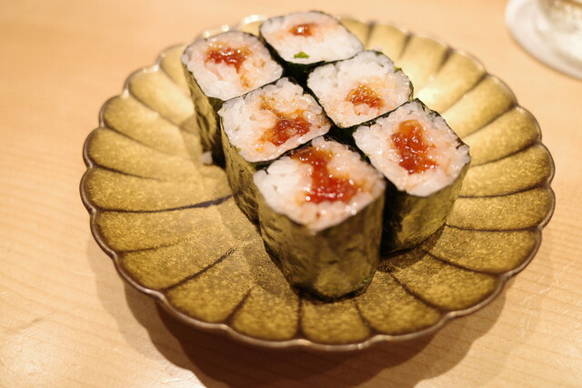 トロと一緒に海ブドウを巻いた、巻物。プチプチっとした食感も楽しい。