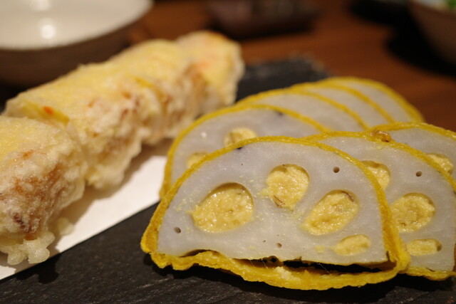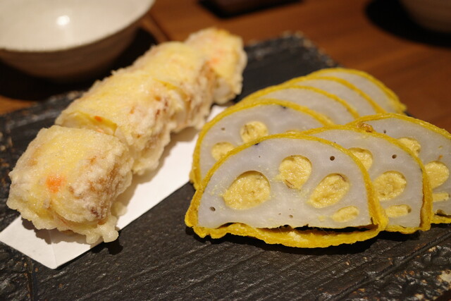 こちらは、辛子れんこんとちくわサラダ天の盛り合わせ。