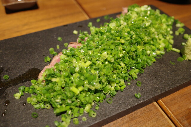 厚切りの和牛のたたきに、たっぷりのネギ。