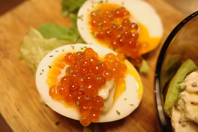 ワインのお供に、半熟卵のアンチョビソース、いくら乗せ。