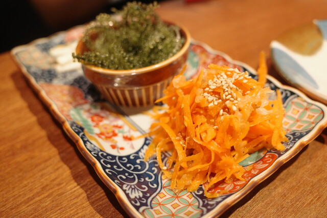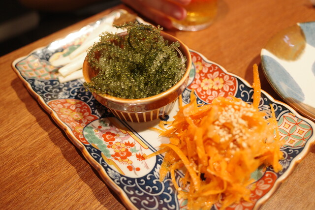 お料理は、琉球チャイニーズ。まずはうみぶどうやにんじんしりしりなど沖縄っぽいおつまみを。