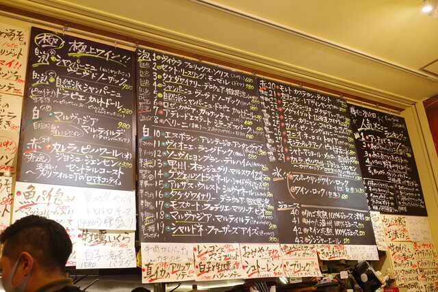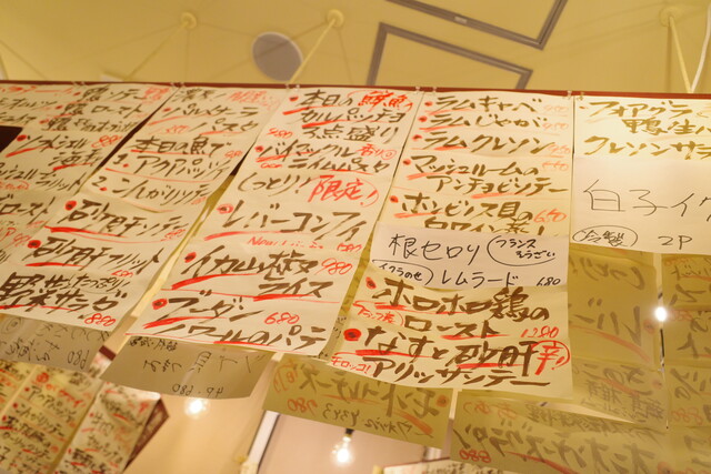 壁一面にはメニューがずらり。ワインを楽しみながら、お料理もしっかり美味しいところが人気のポイント。
