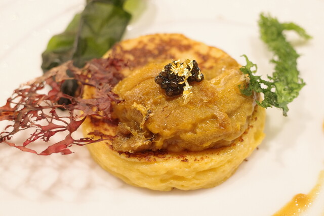 職人さんが目の前で仕上げる、焼きウニのパンペルデュ。