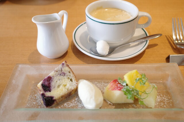 デザートはブルーベリーのケーキにジェラート、そしてフルーツ。