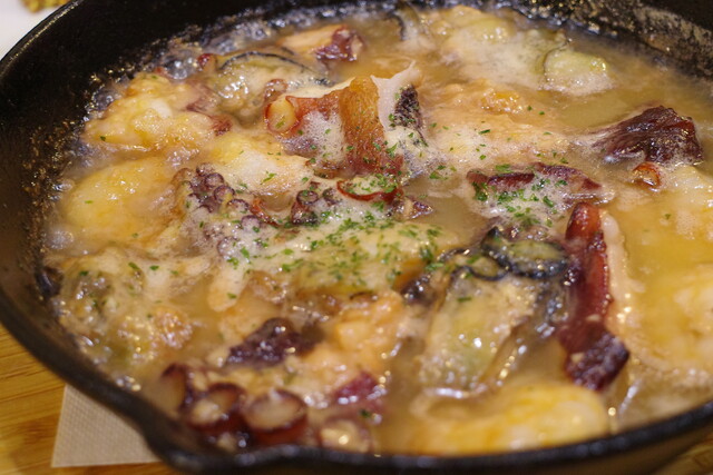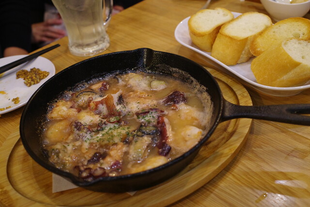 エビや牡蠣、タコなどたっぷりのシーフードを贅沢に味わえるアヒージョ。