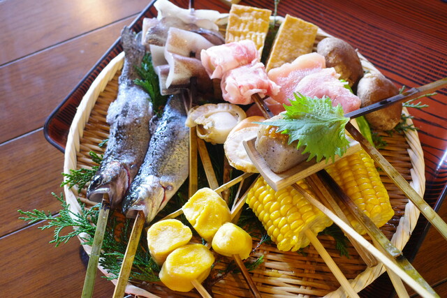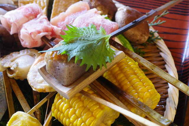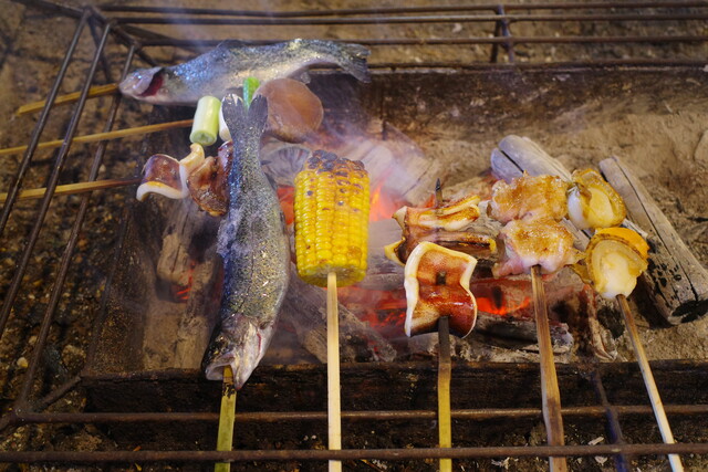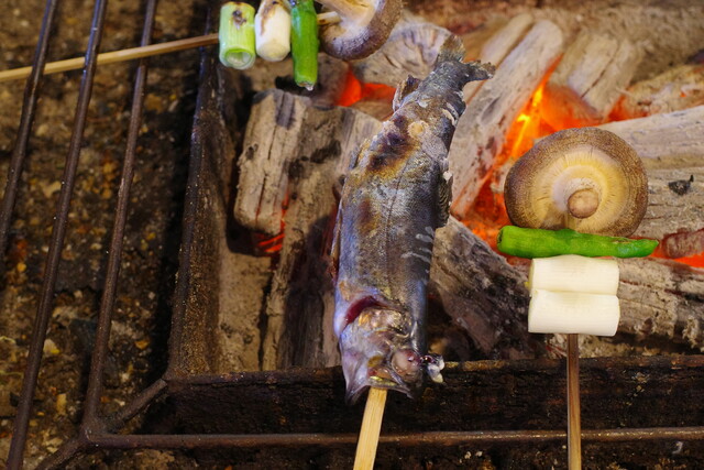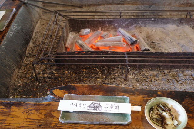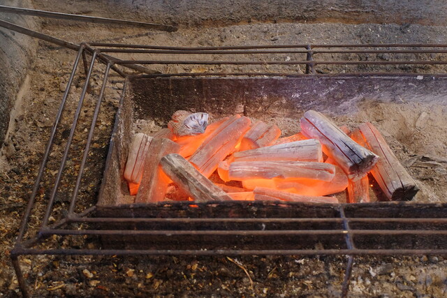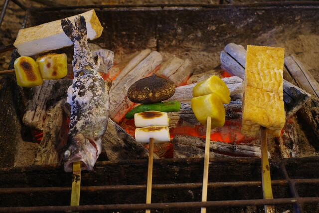 囲炉裏に炭を焚き、ここで食材を焼いていくんです。