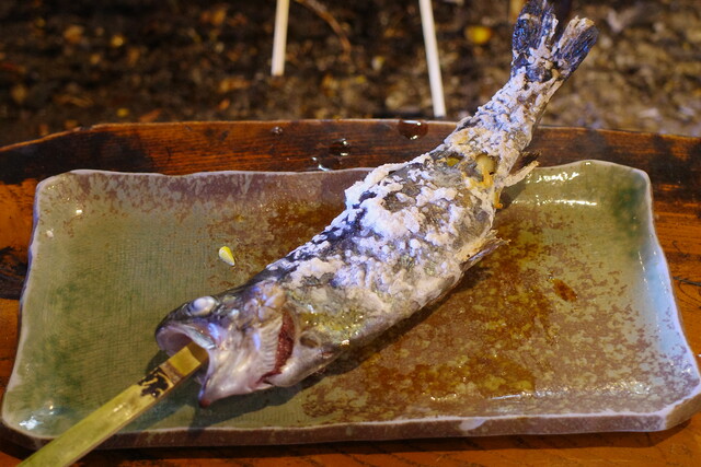 焼きあがった虹鱒は、ほどよい塩加減で旨い…。