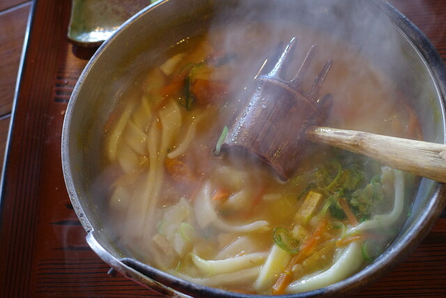 〆はもちろん、名物のほうとうです。野菜たっぷりで大きなお鍋で登場します。