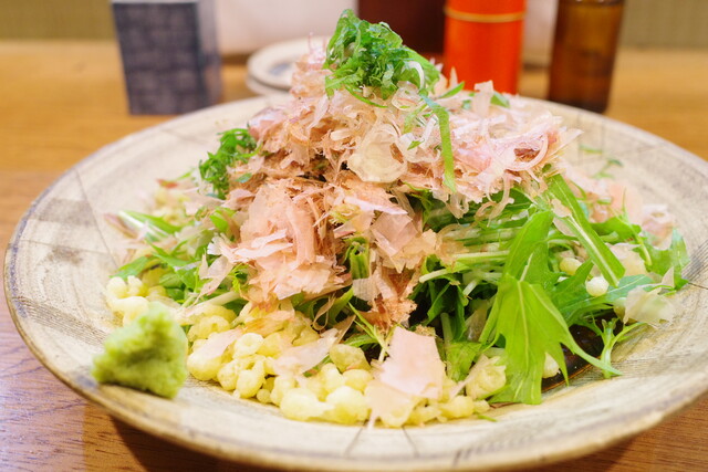 天かすやかつお節、ネギと一緒に、山葵醤油ドレッシングでいただきます。