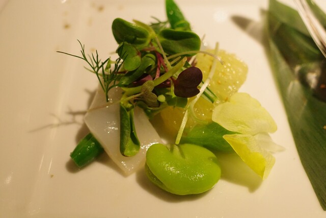 「山口産白イカとさや付き豆 グレープフルーツのハーブマリネ」。