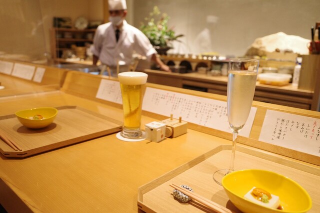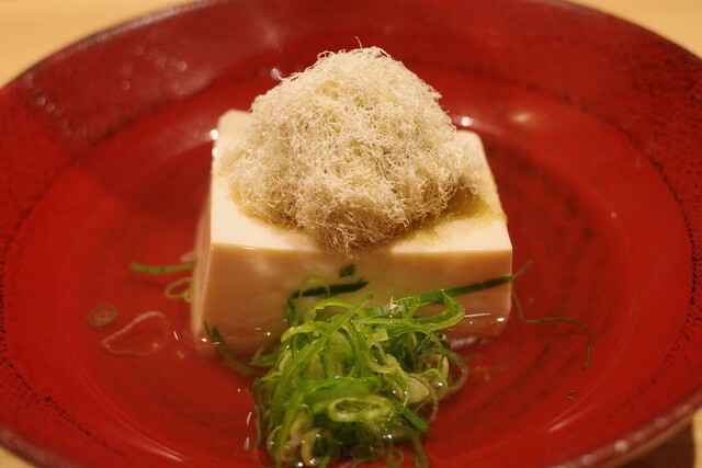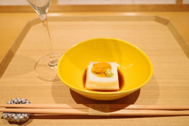 泡で乾杯しつつ、お通しは雲丹の乗った胡麻豆腐。