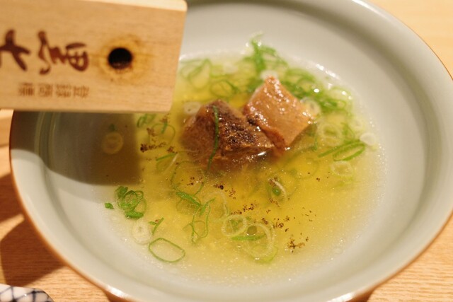 まず最初は名物のさえずり。透き通った美しいお出汁に、黒七味をかけて。