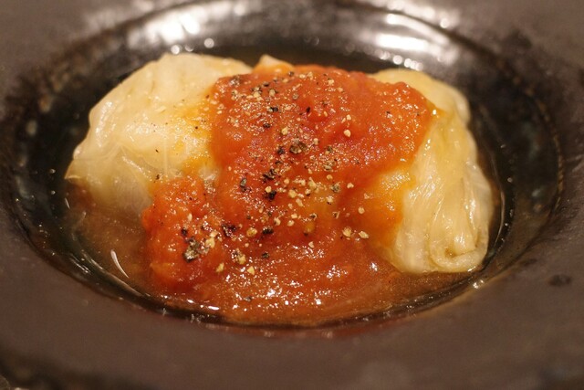 ロールキャベツはトマトソースたっぷり。黒胡椒がぴりっと効いた大人の味。