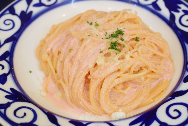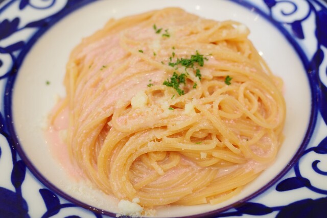 ワインで乾杯しつつ、チョイスしたのは明太子クリームパスタ。