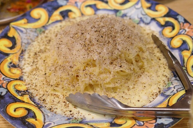 パスタは「カチョエペペ」と「にぼしバターの醤油パスタ」を。カチョエペペはチーズと胡椒のシンプルさで勝負する王道。濃厚でありながら後を引く軽やかさが魅力です。