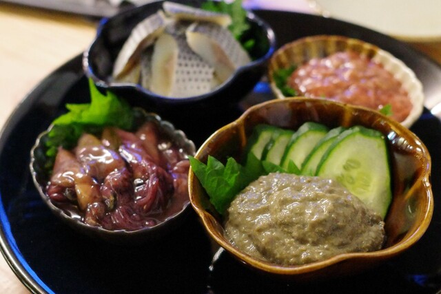 おつまみはホタルイカに〆鯖、蟹味噌に酒盗という酒飲みラインナップ。