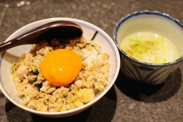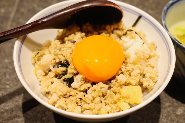 ふわっとそぼろに卵黄を贅沢にオン。少しずつ絡めながらいただきます。