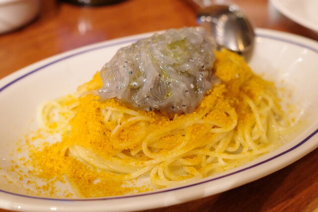 パスタはカラスミパスタの上に生シラスを乗せた贅沢な一皿。