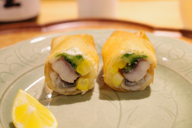 春巻きの皮は薄くてパリパリのサクサク、トウモロコシの甘さが際立ちます。