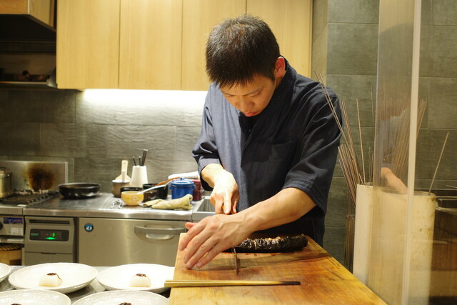 素晴らしい職人技で焼き上げた鰻を目の前でカットしていきます。このライブ感あふれるパフォーマンスも最高ですね。