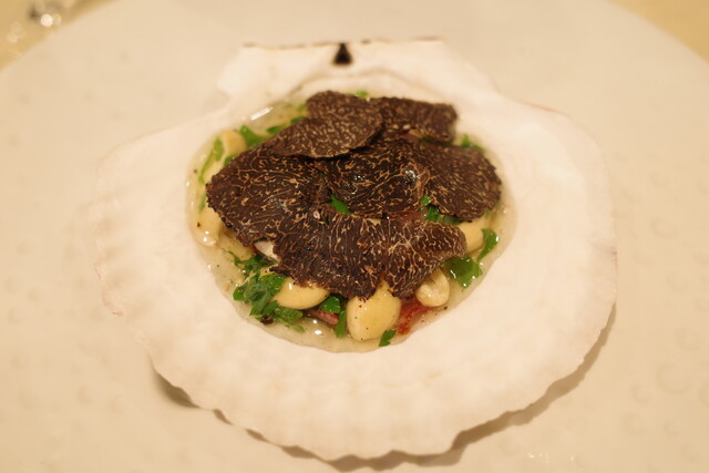 ホタテ貝をまるごと使った一皿。帆立の火入れが完璧。表面は香ばしく、中はふっくらジューシー。