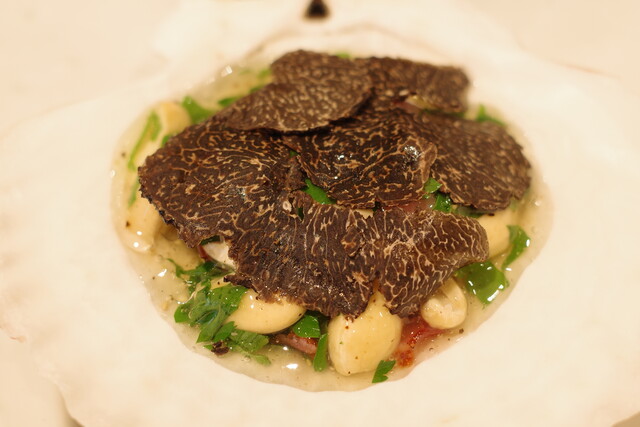 黒トリュフの芳醇な香りが全体を包み、ベーコンの塩味がアクセントに。