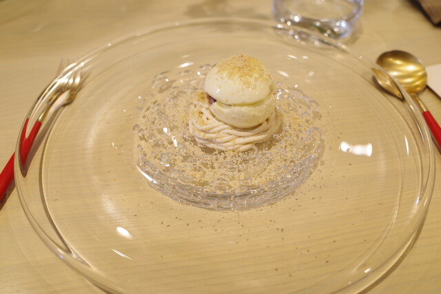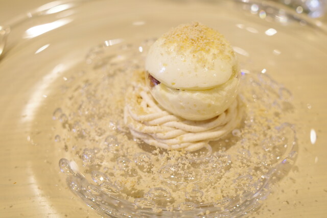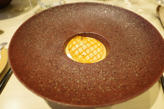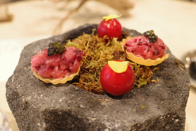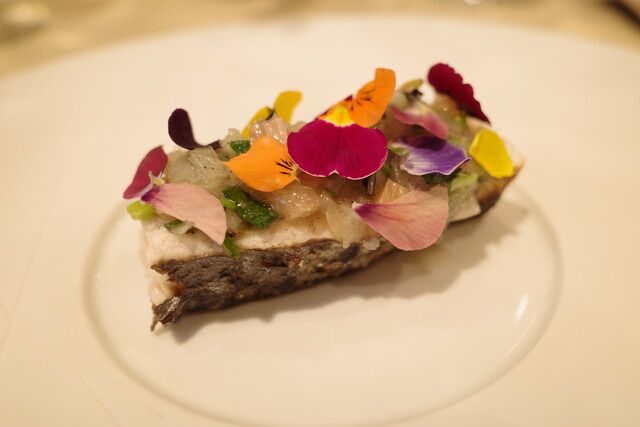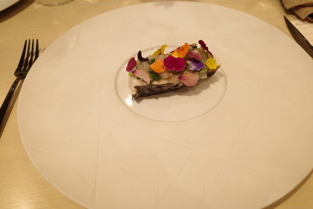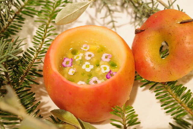林檎を器になっていて、エディブルフラワーが散りばめられています。香りと食感のバランスが見事でした。