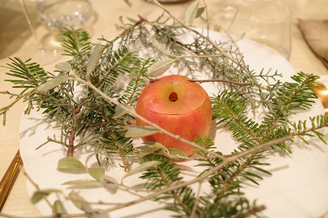 続いて、まるごとりんごを使い、周りにはグリーンが散りばめられたアートな一皿。