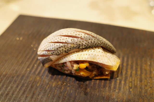 お店のスペシャリテ、京都鰯 × 三陸ムール貝 × 大葉 × 古代米。