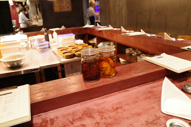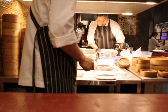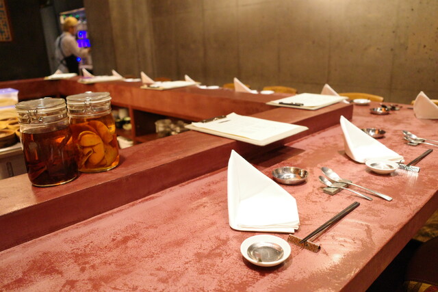 オープンキッチンの向こうでは、料理人たちがリズミカルに中華鍋を振り、せいろから立ち上る湯気がライトに照らされてまるで舞台のよう。ライブ感がすごい。