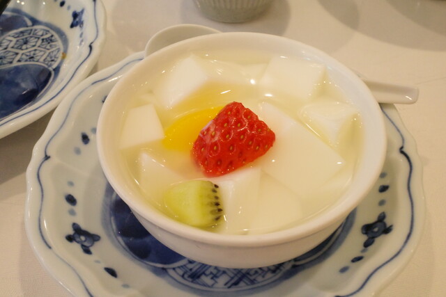 締めに提供される杏仁豆腐は、甘さ控えめでなめらかな食感。麻婆豆腐の辛味をやさしく包み込むデザートで、最後まで大満足です。