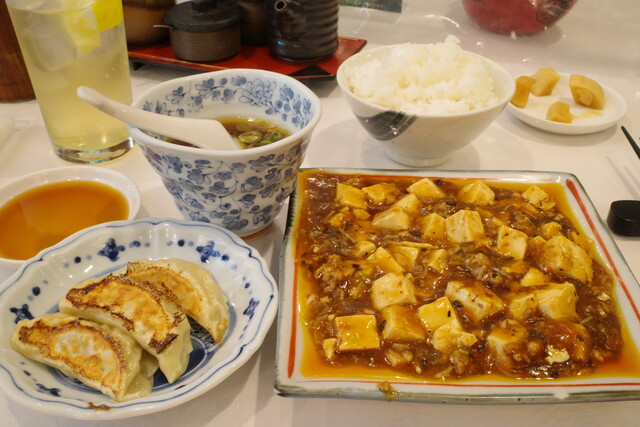 オーダー後10数分ほど待つと、まずはアツアツのスープと小ぶりながらも旨味たっぷりの餃子が到着。続いてメインの麻婆豆腐とライスがサーブされ、テーブルの上は一気に華やかになります。